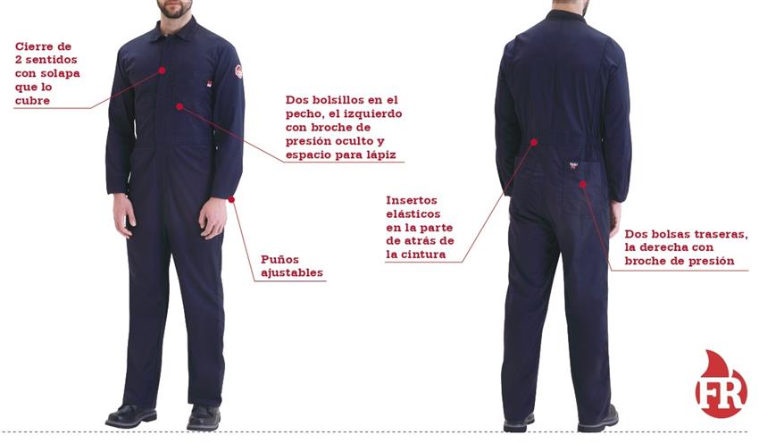 OVEROL DE ALGODON #401. CUENTA CON DOS BOLSILLOS EN EL PECHO, EL IZQUIERDO CON BROCHE DE PRESIÓN OCULTO Y ESPACIO PARA LÁPIZ. DOS BOLSAS TRASERAS, LA DERECHA CON BROCHE DE PRESIÓN. AL FRENTE TIENE CIERRE DE DOS SENTIDOS CON SOLAPA QUE LO CUBRE. CUENTA CON PUÑOS AJUSTABLES E INSERTOS ELÁSTICOS EN LA PARTE DE ATRÁS DE LA CINTURA. ES DE GABARDINA 100% ALGODÓN DE 7.3 OZ.