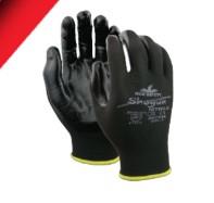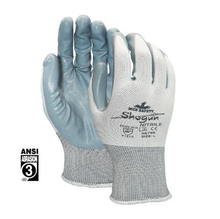 El guante 96799B Shogun está fabricado con base de poliéster calibre 13 y recubrimiento de nitrilo en palma y punta de dedos, ofreciendo una buena sensibilidad táctil, destreza y resistencia a la abrasión. Su acabado liso permite un agarre cómodo en trabajos ligeros. Es un guante económico de uso limitado, no diseñado para largas jornadas, pero ideal para tareas que requieren precisión y protección básica. Su diseño incluye dobladillo codificado por colores, sin forro interno, con estilo de pulgar tipo ala y empaque individual por par.