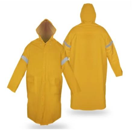 Este impermeable con capucha es altamente resistente gracias a su grosor de 0.33 mm. Presenta tiras reflectantes de 2 pulgadas en los brazos y las piernas para aumentar la visibilidad del usuario en condiciones de poca luz. La capucha incluye una jareta de ajuste para un mejor ajuste. El impermeable está diseñado con un cierre y solapa para brindar una mayor impermeabilidad, y cuenta con ventilación en la espalda para ofrecer comodidad y frescura. Está fabricado en PVC con soporte de poliéster virgen y es ideal para proporcionar excelente protección en condiciones de lluvia, especialmente para trabajos al aire libre o en exposición directa al agua. El sistema de sellado se realiza con alta frecuencia para garantizar su durabilidad. El gorro está integrado y cubre toda la cabeza como una sola pieza, incluyendo un cordón de ajuste. El impermeable dispone de una bolsa a cada lado, broches de ajuste en las muñecas y botones plásticos para evitar la oxidación. También cuenta con ventilación en la espalda y las axilas, además de cintas reflectantes de 2 pulgadas en los brazos.