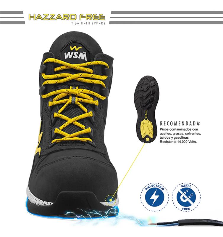 Propiedades de la suela: Antiderrapante, antifatiga, dieléctrica (resistencia hasta 14,000 volts), resistente a grasas, aceites, ácidos y solventes