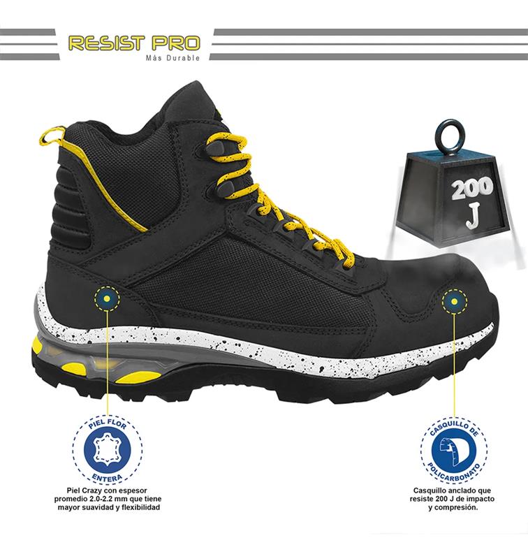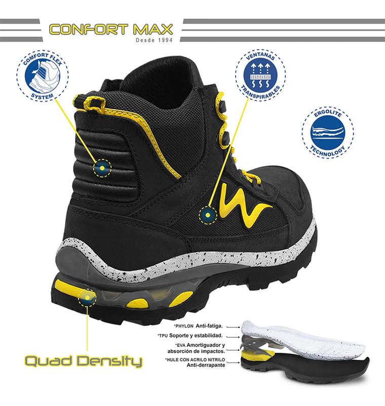 Cuenta con puntera de policarbonato, más amplia y ligera, y un forro textil Drilex 100% transpirable, que lo hacen ideal para largas jornadas en pisos contaminados con aceites, grasas, ácidos, solventes y gasolinas. Su diseño tipo borceguí protege el tobillo con una altura de 16 cm y ofrece estabilidad en cada paso gracias a su sistema Comfort Flex y plantilla anatómica antibacteriana.