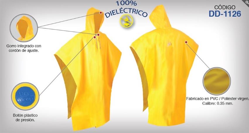 Este impermeable tipo capamanga está diseñado para proteger al usuario contra la humedad y la lluvia. Está fabricado con tela de PVC resistente, que es adecuada para el trabajo continuo. La combinación de PVC y poliéster virgen garantiza la resistencia al agua y al uso constante. Se asegura con un botón plástico de presión en el frente. Con una longitud de 2.20 metros, proporciona una amplia cobertura para proteger al usuario de la lluvia y la humedad. Este impermeable es especialmente útil en trabajos de limpieza, construcción, actividades de pesca y lavado en rastros y empacadoras de alimentos.