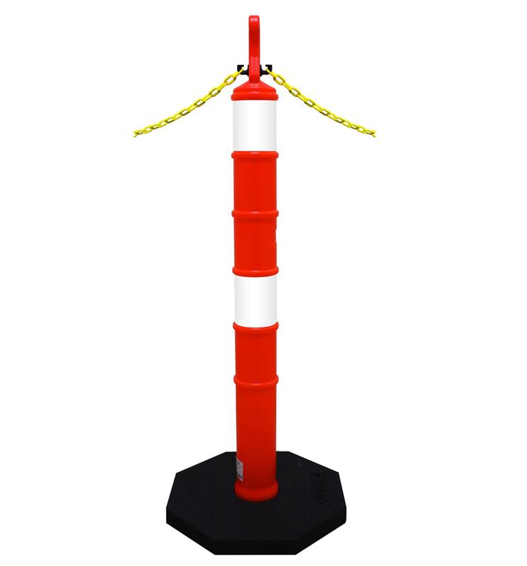 El poste color naranja con base negra es un dispositivo utilizado para delimitar áreas y señalar obras en construcción u otras zonas de precaución. Está diseñado con un poste de polietileno (PE) anaranjado y una base octagonal de color negro fabricada en caucho reciclado.