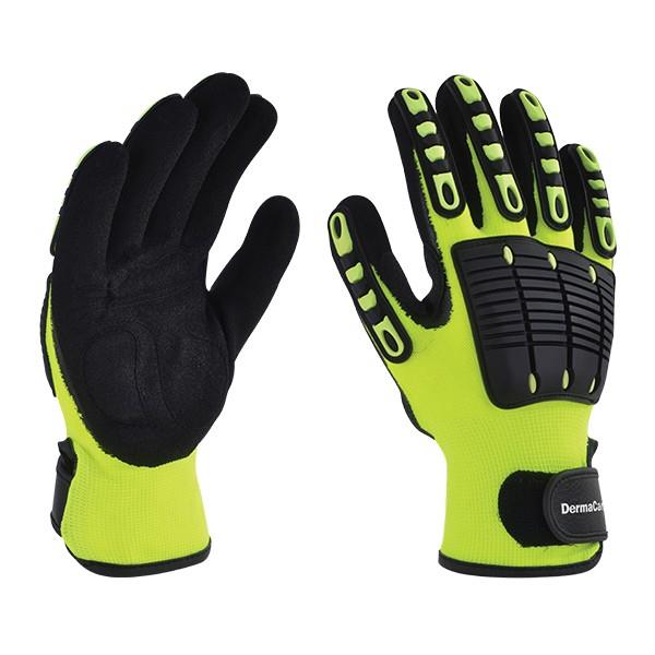 Guante de nylon amarillo fluorescente, recubierto de nitrilo negro en palma con gomas internas en la parte baja de la mano, reforzado entre los dedos pulgar e índice. Cuenta con tiras de pvc negro y amarillo en dedos y palma como protección adicional y velcro para ajuste y cierre en el puño.