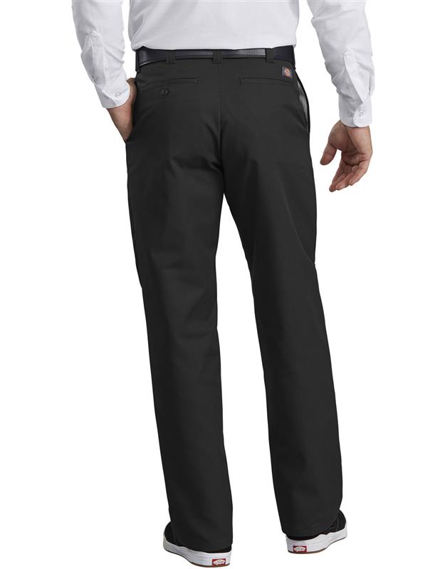El pantalón de frente liso, se asienta debajo de la cintura, tiene un ajuste esbelto del tiro con pierna recta. Está elaborado con la gabardina de polialgodón Dickies y cuenta con tecnología Stay Dark que mantiene sus colores intactos, también es resistente a las arrugas y fácil de desmanchar.