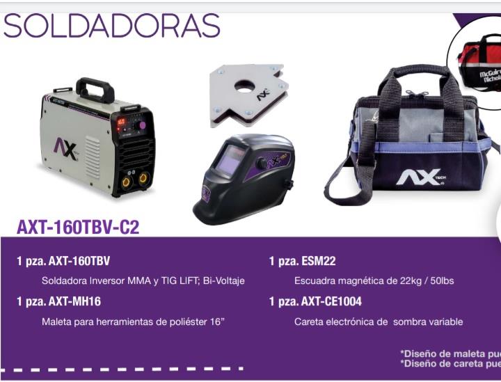 El paquete de soldadora es un conjunto completo diseñado para satisfacer tus necesidades de soldadura y manipulación de herramientas. Incluye la versátil AXT-160TBV-C2, una soldadora inversora MMA y TIG LIFT con capacidad de bi-voltaje (110-220V). La maleta para herramientas AXT-MH16 de poliéster, resistente y espaciosa, facilita el transporte de tus equipos. Además, cuenta con la ESM22, una escuadra magnética de 22 kg (50 lbs) para asegurar piezas durante la soldadura, y la AXT-CE1004, una careta electrónica de sombra variable para protección visual óptima.