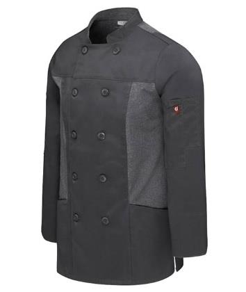 Su frente de doble solapa con botones coordinados y dos bolsas al frente, muestra un aspecto refinado y accesible de la misma manera que sus mangas anchas con sus puños reversibles proporcionan versatilidad. Como toque final incluye una bolsa dual en la manga, para tener a la mano las herramientas de chef, y un cuello forrado que añade confort. La versión para mujer tiene un corte relajado