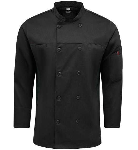 Su frente de doble solapa con botones coordinados y dos bolsas al frente, muestra un aspecto refinado y accesible de la misma manera que sus mangas anchas con sus puños reversibles proporcionan versatilidad. Como toque final incluye una bolsa dual en la manga, para tener a la mano las herramientas de chef, y un cuello forrado que añade confort.
