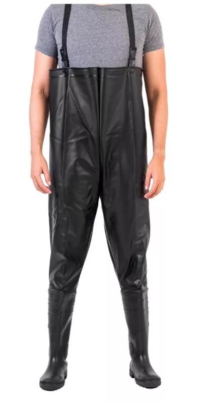 - La bota incluye una pantalonera de PVC con peto y tirantes ajustables, vulcanizados a la bota, formando una sola pieza. La altura promedio de la pantalonera es de 90 cm.