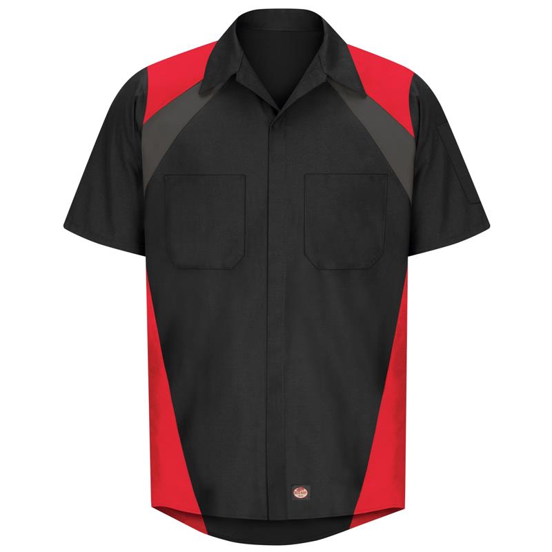 Esta camisa para hombre de manga corta destaca por su diseño tricolor en tonos rojo, negro y charcoal, que no solo agrega estilo, sino también funcionalidad. Está confeccionada con un material que retiene de manera excepcional su color, y cuenta con un acabado resistente a las arrugas que minimiza la necesidad de planchado. La camisa tricolor es ideal para aquellos que buscan una prenda de trabajo duradera y con un toque moderno.