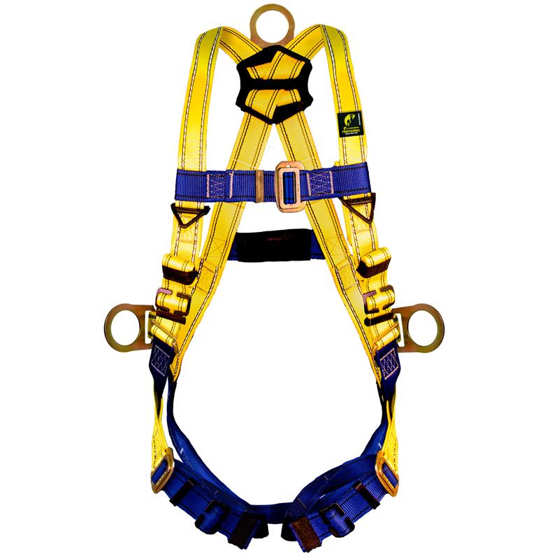 El Arnés de Protección contra Caídas es esencial para trabajos en altura, ascenso y descenso. Confeccionado en banda (eslinga) de poliéster de 1 3/4” de ancho, ahora cuenta con propiedades High Visibility para una mayor visibilidad en diversas condiciones laborales. Equipado con anillo “D” en la espalda de acero, con recubrimiento de zinc y bicromato para prevenir la oxidación. Dispone de anillos “D” en los costados para posicionamiento, con capacidad máxima de 140 kg con herramientas. Ofrece cinco puntos de ajuste: 1 en pecho, 2 en tórax y 2 en pelvis. Cumple con la normativa NOM-009-STPS-2011-4.33 y está certificado bajo la Norma ANSI Z359.11.2014.